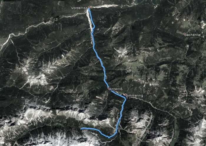 So stapfte ich dann zweieinhalb Stunden am Rißbach entlang bis ich Hinterriß erreichte. Kurz danach setzte ich mich an's Wasser und dort gab es dann Frühstück :-)